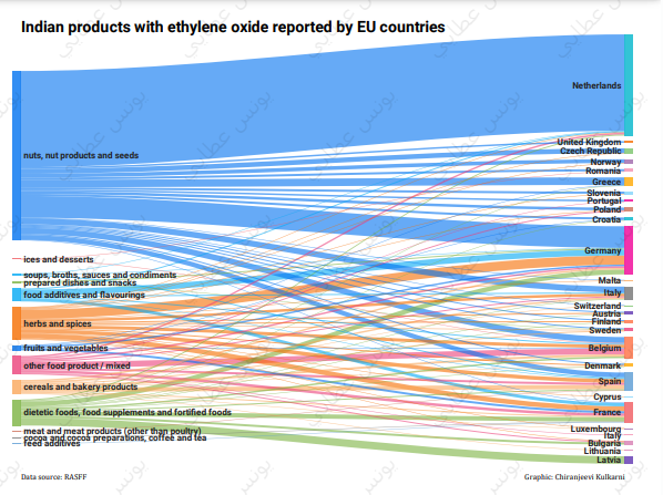سازمان امنیت غذایی اتحادیه اروپا (EFSA)[1] در بازرسیهای خود طی سپتامبر 2020 لغایت آوریل 2024 (شهریور 1399 تا فروردین 1403) در 527 محصول وارداتی از هند مقادیر غیرمجاز ماده شیمیایی «اتیلن اکساید» (Ethylene Oxide) مشاهده کرد که بیشتر آنها در آجیل و دانههای کنجد (313 مورد)، گیاهان و ادویهها (60)، غذاهای رژیمی (48) و سایر محصولات غذایی (34) بودند. از این میزان، تعداد 87 محموله برگشت داده شد و بسیاری از کالاهای وارد شده نیز از بازار جمع آوری شدند.