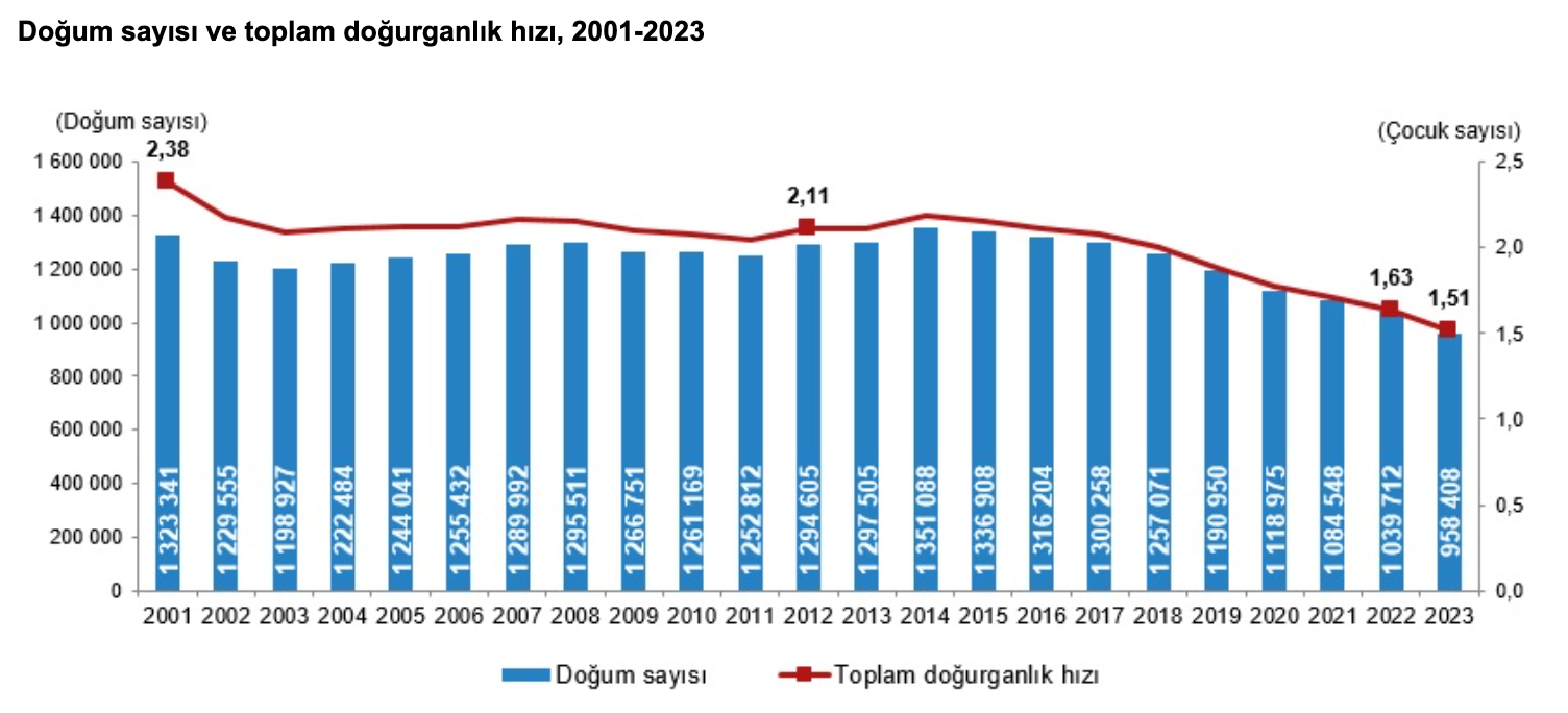 روند گرانیها در ترکیه که از سال 2019 آغاز و در دو سال اخیر شدت بیشتری به خود گرفته است همچنان ادامه دارد. از سوی دیگر، بررسیهای آماری نشان میدهد که رکود اقتصادی طی این سالها بر میزان زادوولد مردم این کشور نیز تأثیر بسزایی گذاشته است. بررسیهای آماری سازمان آمار ترکیه نشان میدهد که نرخ خام زادوولد که به تعداد تولدهای زنده در هر هزار نفر جمعیت اشاره دارد؛ درحالیکه در سال 2001 بالغبر 20.3 در هزار بود، در سال 2023 به 11.2 در هزار رسید. بهعبارتدیگر، درحالیکه در سال 2001 به ازای هر هزار نفر جمعیت، 20.3 تولد وجود داشت، در سال 2023 به ازای هر هزار نفر جمعیت، 11.2 تولد صورت گرفته است. براساس اعلام سازمان آمار ترکیه، میزان زادوولد که در سال 2001 بالغبر یکمیلیون و 323 هزار و 241 نفر بوده است در سال 2023 به زیر یکمیلیون نفر یعنی 958 هزار و 408 نفر رسیده است. در تابلوی زیر تعداد زادوولدهای ترکیه از سال 2001 تا 2023 نشان دادهشده است: (منحنی قرمزرنگ رشد زادوولدها و ستونهای آبیرنگ نیز تعداد زادوولدها و را برای هرسال نشان میدهد)