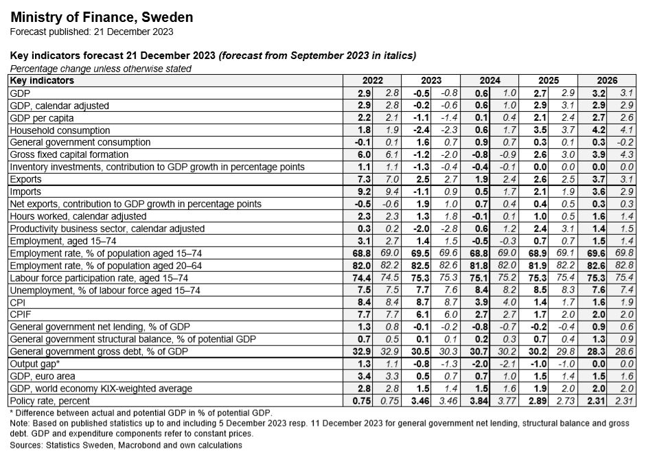 الیزابت سوانتسون، وزیر دارایی میگوید ارزیابی ما این است که رکود برای مدتی ادامه خواهد داشت. اما با توجه به اینکه اکنون مبارزه با تورم به پیروزی رسیده است و همزمان با افزایش دستمزدهای واقعی، نرخ بهره کاهش مییابد، انتظار داریم مصرف خانوارها رشد کند. وضعیت بازار کار در مراحل ابتدایی سال به روند ضعیف خود ادامه داده است. با افزایش بیکاری، نرخ اشتغال کاهش یافته است. انتظار میرود تقاضا برای نیروی کار در طول سال 2024 ضعیف باشد و در نتیجه بیکاری همچنان در حال افزایش باشد. همچنین انتظار میرود که با افزایش تقاضا برای نیروی کار، اقتصاد در سال 2025 به تدریج بهبود یابد. جدول زیر، جزئیات پیشبینی وزارت دارایی سوئد از شاخصهای کلیدی اقتصاد این کشور را نشان میدهد.