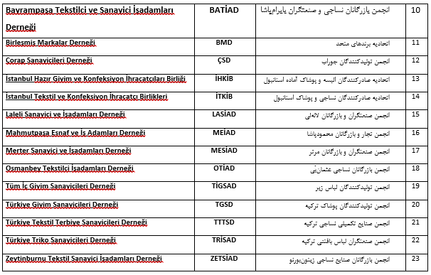 به سبب ریشه دار بودن صنعت نساجی و پوشاک در جمهوری ترکیه و سهم بالای آن در اقتصاد ملّی و محلّی و نقش پیشران این بخش در ارزش آفرینی و کارآفرینی این کشور و وفور متخصصین و نیروی انسانی مسلط به این صنعت و همچنین انباشت سرمایه، ماشین آلات، دانش فنی و تجاری، تشکلها و انجمنهای مختلفی در ترکیه تاسیس یافته اند که در کنار مسائل تولیدی و تجاری، به مدیریت و حل وفصل قضایای صنفی، حرفه ای و مهارتی اعضای خود از مقیاس محلی تا بین المللی می پردازند.