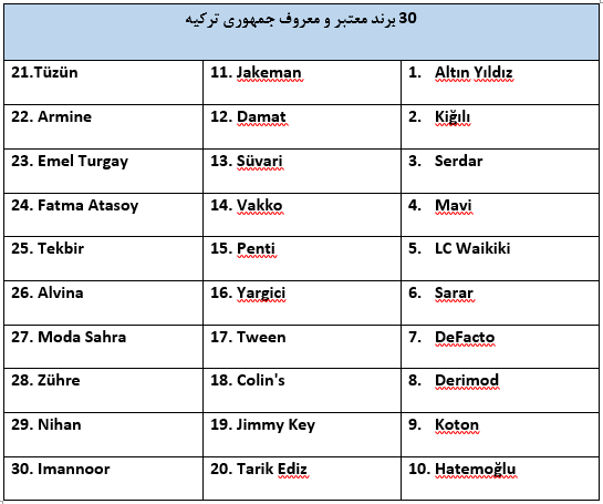 جدول ذیل 30 برند معتبر و شناخته شده جمهوری ترکیه را معرفی میکند: