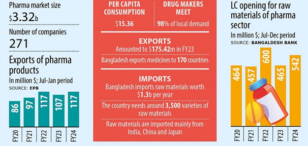 بنگلادش برای تامین حدود 85 درصد مواد خام مورد نیاز برای تامین نیازهای صنعت دارو سازی ، به واردات متکی است و حدود 3500 نوع مواد خام مورد نیاز را از هند، چین،کره، ژاپن و ...وارد میکند. این واردات سالانه حدود 1.3 میلیارد دلار برای این کشور هزینه دارد.