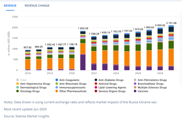 در خلاصه گزارش دیگری از پیش بینی بازار دارو در مالزی منتشره از سایت Statista موارد زیر برجسته شده است[3]