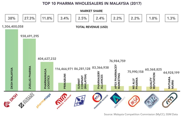 شرکتهای چند ملیتی همچنین نقش مهمی در بازار مصرف دارو در مالزی دارند بر اساس دادههای کمیسیون رقابت مالزی در سال 2017، ده شرکت برتر بیش از 93 درصد کل بازار فروش عمده دارو را اختیار دارند. که از این میزان حدود 65 درصد به دو شرکت DKSH و ZUELLIG اختصاص دارد