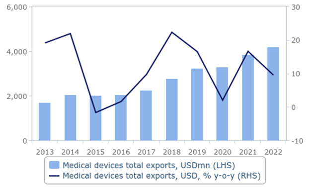 در سال 2022، صادرات تجهیزات پزشکی مالزی با 9.5 درصد افزایش بر حسب دلار آمریکا به 4.2 میلیارد دلار رسید. صادرات تجهیزات پزشکی مالزی از سال 2012 به استثنای سال های 2016 و 2020 هر سال رشد داشته است.
