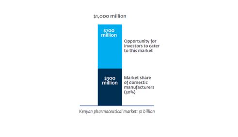 کنیا یک بازار بزرگ برای محصولات دارویی تولید شده بومی است. وجود معاهدات تجاری متعدد این کشور به تولیدکنندگان اجازه میدهد تا به بازار کشورهای دیگر منطقه دسترسی داشته باشند. فرصت های موجود در بخش دارویی کنیا متاثر از بازار داخلی قابل توجه، دسترسی به بازارهای صادراتی جذاب و فرصت های درمانی موجود در منطقه است.