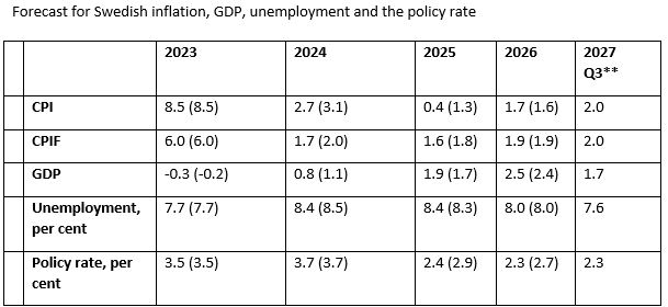 - بنابر اعلام مرکز آمار سوئد، در حال حاضر نرخ تورم بر اساس CPIF برابر با 1.2 درصد و بر مبنای CPI به میزان 1.9 درصد میباشد. در زمان انتشار گزارش پیشین سیاست پولی بانک مرکزی، نرخ تورم بر اساس CPIF برابر با 1.7 درصد و بر مبنای CPI به میزان 2.6 درصد بود که حاکی از کاهش نرخ تورم میباشد. همچنین نرخ بیکاری 8.4 درصد اعلام شده است.