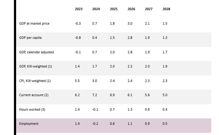 این گزارش ادامه می دهد چرخش در اقتصاد به این معنی است که بیکاری در طول سال آینده کاهش خواهد یافت. طبق این گزارش بانک مرکزی به تدریج نرخ بهره را در تابستان آینده به 1.75 درصد کاهش خواهد داد. لایحه بودجه برای سال 2025 کمک میکند تا پس انداز مالی عمومی - 0.6 درصد از تولید ناخالص داخلی در سال آینده باشد. فضا برای اقدامات بدون بودجه در سال های 2026-2028 بالغ بر 106 میلیارد کرون یا حدود 35 میلیارد کرون در سال است که تقریباً با یک بودجه متوسط مطابقت دارد. تولید ناخالص داخلی سوئد از پایان سال 2021 با افزایش و کاهش متناوب برای فصل های جداگانه رشد ضعیفی داشته است. در سه ماهه دوم سال جاری، تولید ناخالص داخلی اندکی کاهش یافت. صادرات نسبتاً قوی بود، اما سرمایهگذاریها در کل کاهش یافت و خانوارها میزان مصرف را اندکی کاهش دادند. بنابراین رکود در اقتصاد سوئد عمیق تر شد. در بازار کار، توسعه آنچنان ضعیف نبود. تعداد افراد شاغل در سه ماهه دوم اندکی افزایش یافت و بیکاری در 8.3 درصد ثابت ماند.