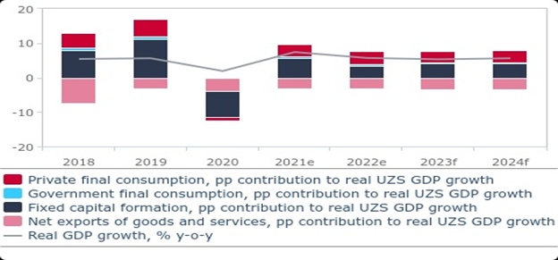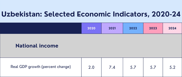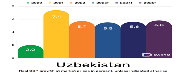 چشم انداز رشد پایدار: همه آژانس ها چشم انداز رشد پایدار و مثبت را برای ازبکستان پیش بینی میکنند. پیشبینیهایی مانند 5.5 درصد بانک توسعه آسیایی برای سالهای 2023-2024، پیشبینی اصلاحشده 5.3 درصد موسسه فیچ برای سال 2023، و افزایش تدریجی بانک جهانی از 5.5 درصد به 5.8 درصد برای سالهای 2023-2025، همه نشانگر پیشرفت اقتصادی پایدار و همگرا در اقتصاد ازبکستان میباشد.