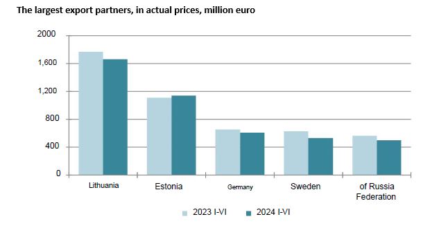 طی ژانویه تا ژوئن 2024، غالبا صادرات ماشین‌آلات و دستگاه‌های مکانیکی وگوشی‌های هوشمند به لیتوانی (112.7 میلیون یورو) شیر، خامه و محصولات لبنی و محصولات کشاورزی و غذایی به استونی و آلمان (30.2 میلیون یورو و 36.6 میلیون یورو) ، نوشیدنیها به فدراسیون روسیه (66.9 میلیون یورو) و چوب و محصولات آن، به سوئد داشتند (90.7 میلیون یورو) انجام شده است.