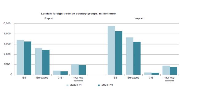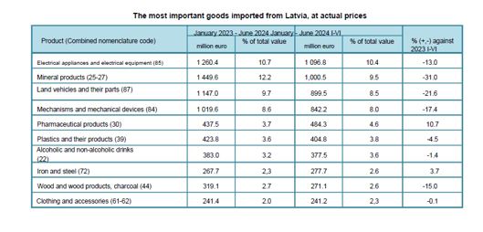 از سوی دیگر، حجم واردات لتونی شامل واردات کالا از کشورهای اتحادیه اروپا در ژانویه - ژوئن 2024، معادل 8546.5 میلیون یورو یا 81.2 درصد که 6453.4 میلیون یورو 61.3 درصد از کشورهای منطقه یورو بوده است. در این مدت میزان واردات از کشورهای CIS معادل 421.1 میلیون یورو یا 4 درصد و از دیگر کشورهای 1558.8 میلیون یورو یا 14.8 درصد بوده است.