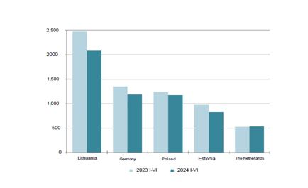 در شش ماهه اول 2024، کالاهای نظیر چوب و محصولات چوبی، زغال چوب غالبا به بریتانیا (20.7٪)، سوئد (13.1٪)، استونی (7.4٪)، لوازم الکتریکی و تجهیزات الکتریکی به لیتوانی (27، 9٪) ، استونی (11.9٪)، لهستان (6.2٪) و محصولات معدنی - به لیتوانی (33.1٪)، استونی (18.4٪) و آلمان  (6.3)  درصد صادر شده است.