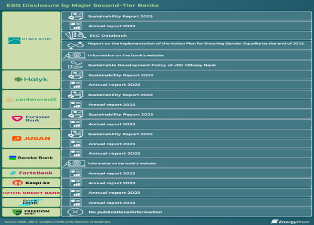 همه بانکهای بزرگ دیگر ESG را در گزارشهای سالانه خود منعکس کرده یا به آن اشاره کردند (بهجز بانک آزادی قزاقستان، که اطلاعاتی در مورد آن در منابع باز یافت نشد). بانک هایی که گزارش های پایداری را نیز منتشر کردند عبارتند از: