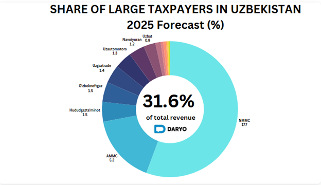 پیشبینی میشود که UzAuto Motors، که یک شرکت پیشرو در تولید خودرو در ازبکستان میباشد، 1.3 درصد به بودجه سال 2025 ازبکستان کمک کند. در 9 ماه اول سال 2024، سهم این شرکت به 171.3 میلیون دلار رسید که نشان دهنده رشد قوی این شرکت است. انتظار می رود تا سال 2026، UzAuto Motors سهم خود را به 1.4 درصد افزایش دهد که نشان دهنده نقش رو به گسترش تولید در ازبکستان و توسعه بخش کارخانه در این کشور میباشد.