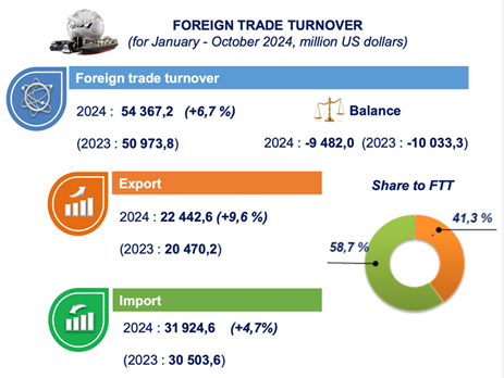 واردات طی بازه زمانی مورد نظر به مبلغ 31.925 میلیارد دلار رسیده است، که نسبت به ژانویه تا اکتبر 2023 رشد 4.7 درصدی را نشان می دهد. دستههای اصلی واردات شامل ماشین آلات و تجهیزات حمل و نقل (35.1درصد)، کالاهای صنعتی (15.6درصد) و مواد شیمیایی و محصولات مرتبط است. (12.2درصد). تحلیل پویایی واردات نشان دهنده این است که واردات کالا با افزایش 535.7 میلیون دلاری نسبت به مدت مشابه در سال 2023 به 28.991 میلیارد دلار رسیده است. این در حالی است که واردات خدمات بالغ بر 2.933 میلیارد دلار بوده است.
