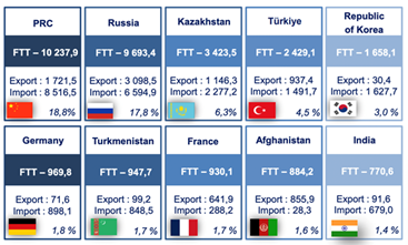 در ساختار گردش تجارت خارجی این کشور، تاشکند سهم قابل توجهی با 38.5 درصد (20.91 میلیارد دلار) را در اختیار دارد، در حالی که کمترین سهم در منطقه Surkhandarya با 0.6 درصد (323.7 میلیون دلار آمریکا) ثبت شده است.