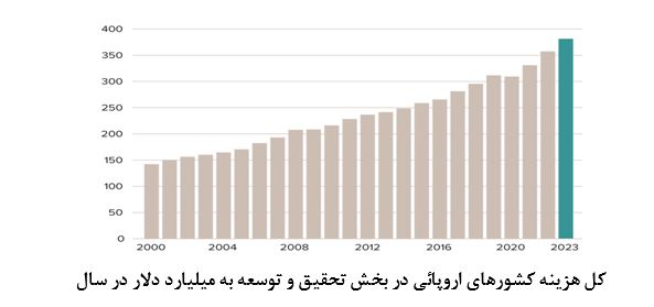 بررسیهای یورواستات نشان می دهد که سرمایه گذاری کشورهای اروپایی در زمینه تحقیق و توسعه (RD) روند روبه رشدی داشته است. در سال 2023 کشورهای اتحادیه اروپا مجموعاً 381 میلیارد یورو یا 2.2 درصد از تولید ناخالص داخلی خود را برای این امر هزینه کرده اند. براساس بررسیهای این مرکز، دو سوم این سرمایه گذاریها توسط شرکت های تجاری انجام شده است.