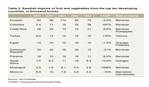 به عنوان نسبت کل واردات اروپا، واردات سوئد (موز) از نیکاراگوئه، جمهوری دومینیکن، پاناما و اکوادور نسبتاً بالاست. با این حال، سوئد به ندرت میوه یا سبزیجات تازه را از پرو، ساحل عاج و برزیل وارد میکند.