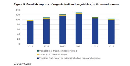 سوئد به عنوان ششمین واردکننده بزرگ محصولات کشاورزی-غذایی ارگانیک اروپا، محل 310 واردکننده محصولات ارگانیک و 1093 فرآوری است. واردات میوه و سبزیجات ارگانیک این کشور در سال 2021 با 129 هزار تن به اوج خود رسید. پس از آن، آنها به 104 هزار تن در سال 2023 کاهش یافتند. بیشتر این واردات موز از اکوادور (66 هزار تن در سال 2023)، کلمبیا (17 هزار تن) و جمهوری دومینیکن (14 هزار تن) است. از آنجایی که مصرف سوئد میوهها و سبزیجات ارگانیک در سالهای آینده افزایش مییابد، احتمالاً واردات نیز از همین روند پیروی خواهد کرد.