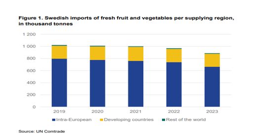 سوئد به شدت به واردات میوه و سبزیجات تازه متکی است. در سال 2023، کشورهای در حال توسعه 215 هزار تن میوه و سبزیجات تازه را به سوئد عرضه کردند. اینها عمدتاً شامل موز (74 درصد)، پس از آن پرتقال (6 درصد)، سیب، ماندارین و سیب زمینی (هر کدام 2 درصد) بودند.