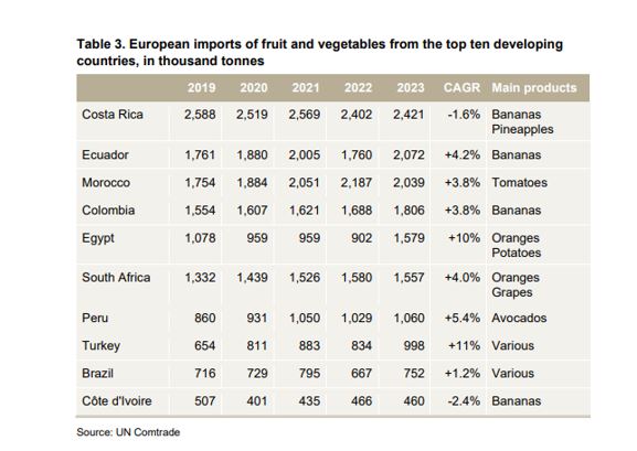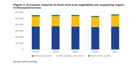 کشورهای در حال توسعه تقریبا یک سوم واردات میوه و سبزیجات تازه اروپا را تامین میکنند. در سال 2023، این کشورها 18 میلیون تن از این محصولات را عرضه کردند. این کالاها عمدتا شامل موز (37 درصد)، پرتقال (6 درصد)، گوجه فرنگی (6 درصد)، آناناس (5 درصد)، آووکادو (5 درصد)، انگور (4 درصد) و هندوانه (4 درصد) است.