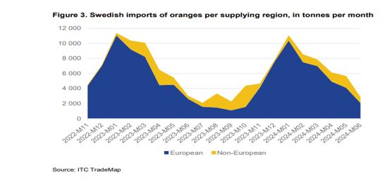 فصلی بودن اروپا نیز در واردات سوئد از جمله واردات پرتقال نقش دارد. اسپانیا تولید کننده اصلی پرتقال در اروپا و همچنین بزرگترین تامین کننده سوئد است. برای تامین کنندگان کشورهای در حال توسعه در نیمکره جنوبی، فرصت های جالبی در طول فصل خارج از فصل اسپانیا - بین ماه مه و نوامبر - وجود دارد.