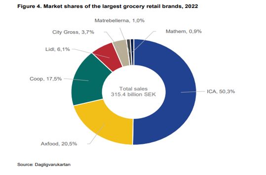 در میان این فروشگاههای زنجیره ای، ICA حدود نیمی از سهم بازار را در اختیار دارد و پس از آن Axfood شامل سوپرمارکتهای( Willys و Hemköp) ، Coop، Lidl و City Gross در سال 2024 توسط Axfood خریداری شد. همچنین تعدادی خرده فروش کوچکتر نیز وجود دارند، اما سهم بازار آنها محدود است. یک پیشرفت جالب این است که Lidl سوئد بیش از دو برابر سریعتر از بقیه بازار رشد میکند یعنی18 درصد در مقایسه با 6.8 درصد. سال 2022/2023 ششمین فصل متوالی بود که لیدل سوئد سریعتر از بقیه شرکتهای این بخش از صنعت رشد کرد.
