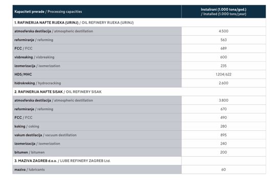 بطور کلی صنعت نفت کرواسی را چندین میدان کوچک نفتی با مجموع ذخایر 71 میلیون بشکه، یک پایانه نفتی در بندر اومیشالی، یک شبکه از مخازن ذخیره نفت، دو پالایشگاه (یکی در ریه کا و دیگری در سیساک) و یک خط لوله نفت که از اومیشالی نشات میگیرد و به پالایشگاه شهر سیساک در کرواسی و به پالایشگاه شازالومباتا (Szazhalombata) در مجارستان و به پالایشگاههایی در صربستان ، بوسنی و هرزه گوین، اسلواکی و جمهوری چک می رسد، شامل میشود. پالایشگاههای ریه کا و سیساک در مجموع ظرفیتی معادل 90 هزار بشکه در روز دارند و توسط شرکت بزرگ کروات مجاری INA اداره میشوند. تاکید میشود که تنها حدود 20 درصد نیاز از نفت خام داخلی با پمپاژ نفت از میادین تولیدی داخلی تامین میشود. از سال 2020، وابستگی اقتصاد کرواسی به واردات نفت افزایش یافته است و تصور میشود که بیش از 90 درصد از کل نیاز نفت کرواسی از واردات تامین شود.