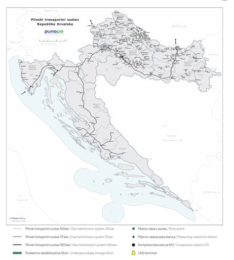 در سال 2022 در مجموع، 41039 تراوات ساعت گاز طبیعی حمل شده است که 14.7 درصد آن از میدانهای تولیدی در قلمرو جمهوری کرواسی بوده است، 13 درصد آن از واردات تامین شده، 64.5 درصدش حاصل پایانههای LNG و 7.8 درصد از آن هم مربوط به انتقال ذخایر گاز زیرزمینی کشور بوده است. مقادیر گاز وارد شده به سیستم حمل و نقل به سیستم های توزیع، به مشتریان نهایی در سیستم انتقال گاز، سیستم های حمل و نقل کشورهای همسایه (حمل و نقل بین المللی) و ذخیره سازی گاز زیرزمینی تحویل داده میشوند. طول کل سیستم انتقال گاز در کرواسی 2544 کیلومتر است که 1573 کیلومتر آن، خطوط لوله گاز با فشار اسمی (Nominal) 50 بار ، 954 کیلومتر آن با فشار اسمی 75 بار و 17 کیلومترش با فشار اسمی 100 بار میباشد.