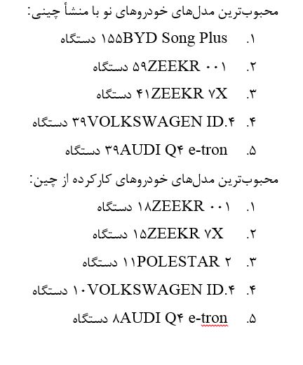 اکثریت قریب به اتفاق خودروهای سواری واردشده از چین، خودروهای برقی بودند(۸۲ درصد)