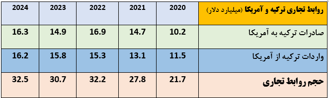 در سال 2024، صادرات ترکیه به آمریکا 16.3 میلیارد دلار و واردات آن 16.2 میلیارد دلار بوده است. از آنجایی که حجم تجارت بین دو کشور همچنان در حال گسترش است، پیش بینی میشود که شاید دولت ترامپ از مالیات های اعمال شده بر ترکیه عقب نشینی کند.
