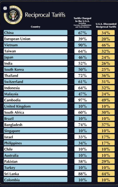 آمریکا روی واردات از کشورهای مختلف تعرفه گذاشته است. بر روی کالاهای اروپایی ۲۰٪ و چینی ۳۴٪ تعرفه اعمال کرده است. برای بقیه کشورها هم درصدهای مختلفی در نظر گرفته شده است. ویتنام ۴۶٪ تایوان ۳۲٪ژاپن ۲۴٪کره جنوبی ۲۵٪ تایلند ۳۶٪ سوئیس ۳۱٪ اندونزی ۳۲٪ مالزی ۲۴٪ کامبوج ۴۹٪ انگلستان ۱۰٪ و آفریقای جنوبی ۳۰٪ .