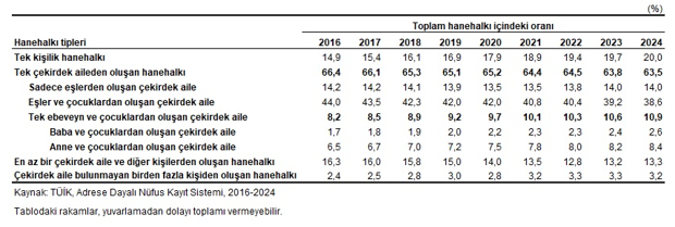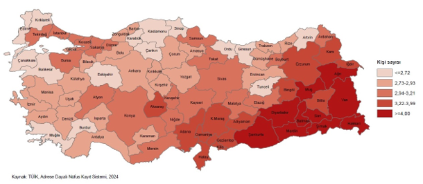 بر اساس نتایج سیستم ثبت جمعیت مبتنی بر نشانی (ABPRS)، میانگین تعداد اعضای خانوار در ترکیه که در سال ۲۰۰۸ تعداد ۴ نفر بود، روند کاهشی را نشان داد و در سال ۲۰۲۴ به ۳.۱۱ نفر کاهش یافت.