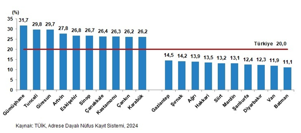 هنگامیکه انواع خانوارها بر اساس استان بررسی شد، مشاهده شد که استانی که بالاترین نرخ خانوارهای تک نفره را در سال ۲۰۲۴ داشت، گوموشخانه با ۳۱.۷ درصد بود. پس از گوموشخانه، تونجلی با ۲۹.۸ درصد و گیرسون با ۲۹.۷ درصد قرار داشتند. از سوی دیگر، استانی که کمترین نرخ خانوارهای تک نفره را داشت، باتمان با ۱۱.۱ درصد بود. پس از این استان، وان با ۱۱.۹ درصد و دیاربکر با ۱۲.۳ درصد قرار داشتند.