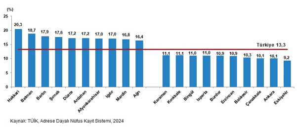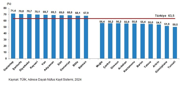 نرخ خانوارهای دارای حداقل یک فرزند در گروه سنی 0 تا 17 سال در ترکیه 42.8 درصد بود. طبق نتایج سیستم ثبت جمعیت مبتنی بر نشانی (ADNKS)، تعداد کل خانوارها در سال 2024 به میزان 26 میلیون و 599 هزار و 261 نفر بود. مشاهده شد که 42.8 درصد از خانوارها حداقل یک فرزند در گروه سنی 0 تا 17 سال داشتند. هنگامیکه توزیع این خانوارها بر اساس استان بررسی شد، مشاهده شد که استان شانلی اورفا با 68.5 درصد، بالاترین نرخ خانوارهای دارای حداقل یک فرزند در گروه سنی 0 تا 17 سال و استان تونجلی با 28.2 درصد، پایینترین نرخ را داشتند.