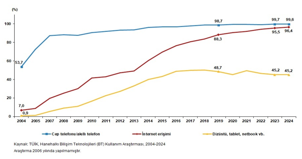 میزان خانوارهایی که کامپیوتر قابل حمل دارند ۴۵.۲ درصد بود. طبق نتایج بررسی استفاده از فناوری اطلاعات خانوار، میزان دسترسی خانوارها به اینترنت از خانه در سال ۲۰۰۴ به میزان ۷ درصد بود، در حالی که این میزان در سال ۲۰۲۴ به ۹۶.۴ درصد افزایش یافت. از سوی دیگر، میزان داشتن کامپیوترهای قابل حمل مانند لپتاپ، تبلت و نت بوک در خانوارها از ۰.۹ درصد به ۴۵.۲ درصد و میزان داشتن تلفن همراه / گوشیهای هوشمند از ۵۳.۷ درصد به ۹۹.۶ درصد افزایش یافت.