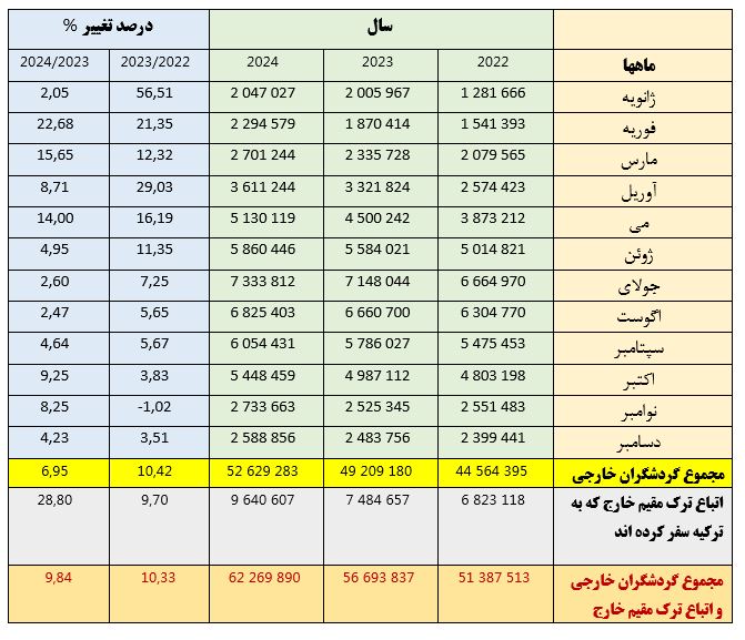 در جدول ذیل تعداد گردشگران خارجی که به ترکیه سفر کرده اند، به تفکیک ماهها برای سالهای مختلف و میزان درصد تغییرات ارائه شده است:
