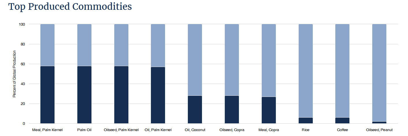 4. محصولات کشاورزی و دریایی: طبق آمار سازمان خدمات کشاورزی خارجی وزارت کشاورزی ایالات متحده، پیش بینی شده اندونزی در سال 2024-2025 58 درصد تولید روغن پالم جهان ( حدود 46 میلیون متر متکعب) را به خود اختصاص دهد. اندونزی تولید کننده کاکائو، قهوه، چای نیز بوده و این محصولات در میان ده محصول برتر صادرات کشاورزی این کشور میباشد. میگو، ماهی و محصولات دریایی از جمله صادرات مهم اندونزی به بازارهای آسیایی و کشورهای توسعهیافته میباشد.