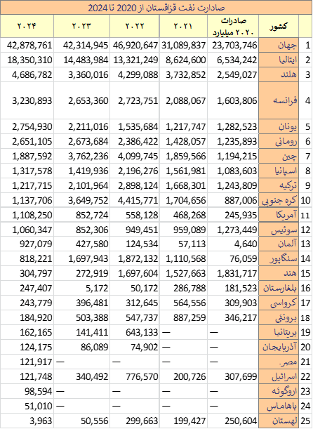 میزان صادارت نفت قزاقستان از 23.7 میلیارد دلار در سال 2020 به 42.8 میلیارد دلار در سال 2024 رسیده است.