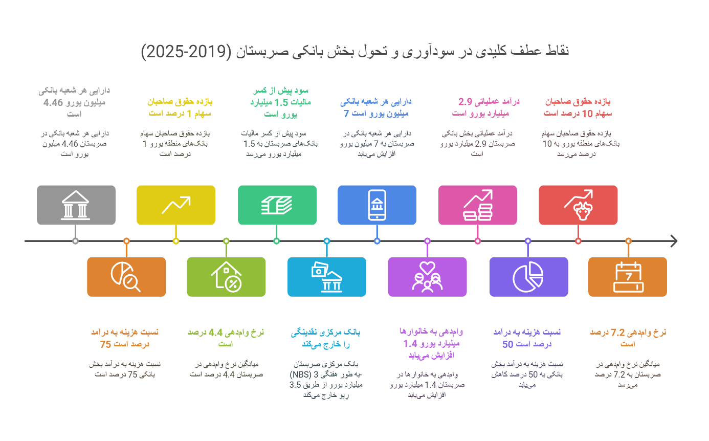 سود پیش از کسر مالیات بانکها در صربستان طی سال گذشته، به ۱.۵ میلیارد یورو رسید. طبق گزارش "نبض بخش بانکی" شرکت EY، بازده داراییها ۲.۸ درصد و بازده حقوق صاحبان سهام ۲۰.۳ درصد بوده است.این ارقام، بالاترین سطح ثبتشده از زمان اصلاحات بخش بانکی در اوایل دهه ۲۰۰۰ به شمار میروند و نشاندهنده تداوم روند صعودی سودآوری از سال ۲۰۲۱ هستند.