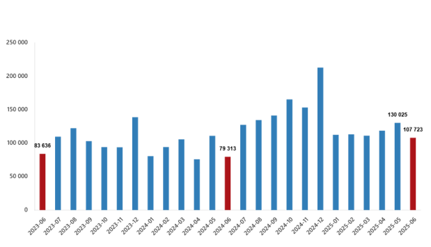 در ماه ژوئن 107 هزار و 723 خانه در سراسر ترکیه فروخته شد. فروش مسکن در سراسر ترکیه در ماه ژوئن در مقایسه با ماه مشابه سال قبل ۳۵.۸ درصد افزایش یافت و به ۱۰۷۷۲۳ رسید.