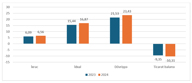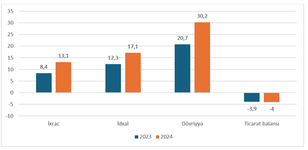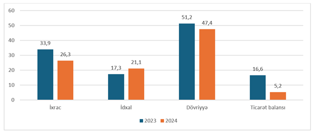 در سال 2024، گردش مالی تجارت خارجی آذربایجان به 47.4 میلیارد دلار رسید. صادرات 26.3 میلیارد دلار یا 55.6٪ از گردش مالی تجارت را تشکیل میداد، در حالی که واردات 21.1 میلیارد دلار یا 44.4٪ را تشکیل میداد (نمودار 1). در نتیجه، تراز تجاری خارجی مثبت 5.2 میلیارد دلار تشکیل شد. در مقایسه با سال 2023، گردش مالی تجارت خارجی 8٪، صادرات 23٪ و واردات 18٪ کاهش یافت.