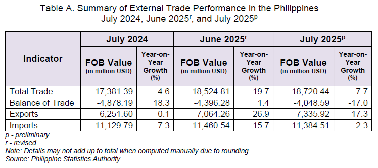 به گزارش مرکز آمار فیلیپین (PSA)، در جولای ۲۰۲۵، حجم کل تجارت خارجی فیلیپین شامل به ۱۸.۷۲ میلیارد دلار رسید که نسبت به مدت مشابه سال قبل، رشد ۷.۷ درصدی را نشان میدهد. این رشد در مقایسه با ماه ژوئن ۱۹.۷ درصد کمتر است اما نسبت به جولای ۲۰۲۴ رشد قابل ملاحظه بوده است. ساختار کلی تجارت همچنان متکی بر واردات باقی مانده و ۶۰.۸ درصد از کل مبادلات مربوط به واردات و ۳۹.۲ درصد مربوط به صادرات بوده است.