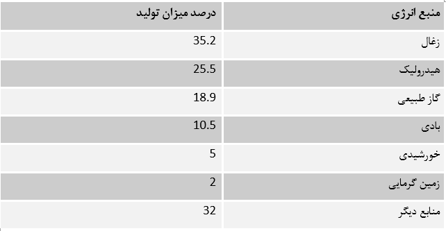جدول منابع تولید برق و درصد میزان تولید در سال 2024 میلادی :