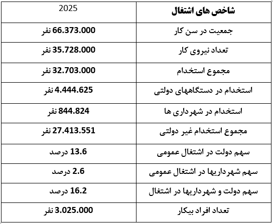 از مجموع ۵,۲۸۹,۴۴۹ نفر کارمندان دولتی، ۴,۴۴۴,۶۲۵ نفر را کارمندان دولتی شاغل در مؤسسات و سازمانهای دولتی، از جمله مؤسسات مشمول بودجه عمومی، شورای آموزش عالی و دانشگاهها، ادارات مشمول بودجه ویژه، مؤسسات نظارتی و کنترلی، مؤسسات تأمین اجتماعی و شرکتهای دولتی تشکیل می دهند، که از این میزان ۳,۳۳۴,۷۹۲ کارمند رسمی، ۴۲۹,۹۶۶ پرسنل قراردادی، ۵۳۴,۷۰۵ کارمند دائم و ۴۶۵۵۸ کارمند موقت و ۹۸,۶۰۴ پرسنل دیگر میباشند.