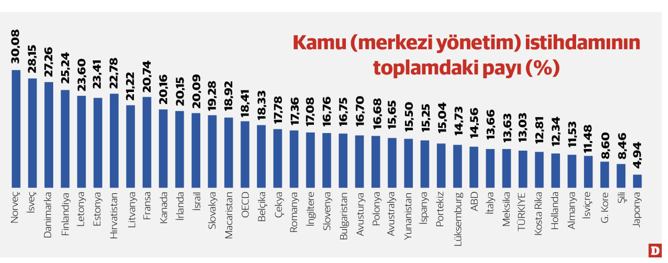 طبق آخرین دادههای OECD، تا سال ۲۰۲۳، که فقط شامل افراد شاغل در دولت میشود، به دلیل وجود اشکال مختلف شهرداریها مانند ساختارهای سیاسی فدرال یا مشابه و سیستمهای ایالتی در کشورها، نرخ اشتغال در بخش دولتی برای ۳۸ کشور ۱۸.۴ درصد است. ترکیه با نرخ ۱۳.۰۳ درصد، رتبه ۳۱ را در بین ۳۸ کشور دارد.