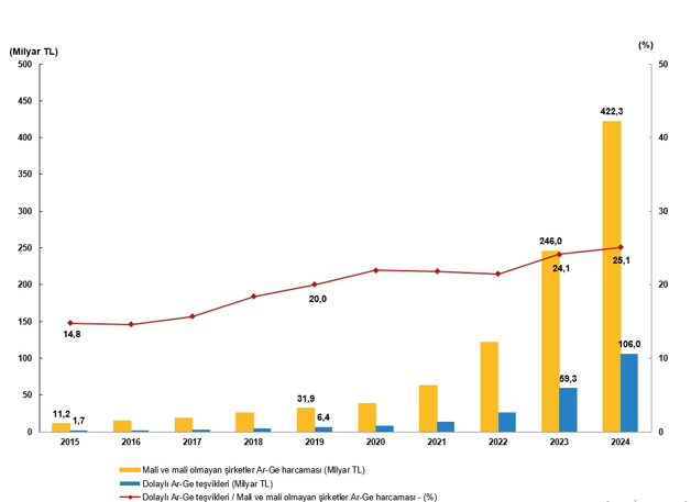 سهم مشوق‌های غیرمستقیم تحقیق و توسعه در هزینه‌های تحقیق و توسعه شرکت‌های مالی و غیرمالی از ۱۴.۸٪ در سال ۲۰۱۵ به ۲۵.۱٪ در سال ۲۰۲۴ افزایش یافت. در حالی که هزینه‌های تحقیق و توسعه شرکت‌های مالی و غیرمالی در سال ۲۰۱۵ به میزان ۱۱.۲ میلیارد لیر ترکیه بود، این هزینه‌ها در سال ۲۰۲۴ به ۴۲۲ میلیارد لیر ترکیه رسید.