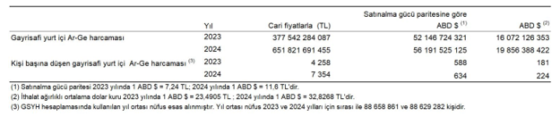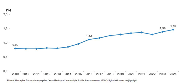 سهم هزینه‌های تحقیق و توسعه در تولید ناخالص داخلی (GDP) به میزان ۴۶٪ بود. در حالی که نسبت هزینه‌های تحقیق و توسعه ناخالص داخلی به تولید ناخالص داخلی در سال ۲۰۲۳ به میزان ۱.۳۹٪ بود، نسبت آن در تولید ناخالص داخلی ۴۴ تریلیون و ۵۸۷ میلیارد و ۲۲۵ میلیون لیر ترکیه در سال ۲۰۲۴ به ۱.۴۶٪ رسید.