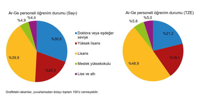 مشاهده شد که 39.9٪ از پرسنل تحقیق و توسعه دارای مدرک لیسانس بودند. پس از آن، دکترا یا معادل آن با 30.6 درصد، مدرک کارشناسی ارشد با 20.3 درصد، هنرستان فنی و حرفه‌ای با 4.9 درصد و دبیرستان یا پایین‌تر با 4.4 درصد قرار داشتند. توزیع پرسنل تحقیق و توسعه به عنوان تمام وقت (FTE) بر اساس سوابق تحصیلی به شرح زیر است : 48.9 درصد دارای مدرک لیسانس، 21.2 درصد دارای مدرک دکترا یا معادل آن، 19.1 درصد دارای مدرک کارشناسی ارشد، 5.8 درصد دارای هنرستان فنی و حرفه‌ای و 5 درصد دارای سطح تحصیلات دبیرستان یا پایین‌تر بودند.
