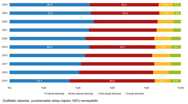 هنگامی‌که شرکت‌هایی که فعالیت‌های تحقیق و توسعه را در صنعت تولید انجام می‌دهند بر اساس سطح فناوری خود طبقه‌بندی شدند، مشاهده شد که ۴۶.۹٪ از ۲۱۰ میلیارد و ۵۰۶ میلیون لیر ترکیه هزینه‌های تحقیق و توسعه در صنعت تولید در سال ۲۰۲۴ از سوی شرکت‌هایی در فعالیت‌های فناوری پیشرفته انجام شده است. از کل هزینه‌های تحقیق و توسعه در صنعت تولید، ۴۰.۲ درصد از سوی شرکت‌هایی با فعالیت‌های فناوری متوسط به بالا، ۸.۲ درصد از سوی شرکت‌هایی با فعالیت‌های فناوری متوسط به پایین و ۴.۷ درصد از سوی شرکت‌هایی با فعالیت‌های فناوری پایین انجام شده است.